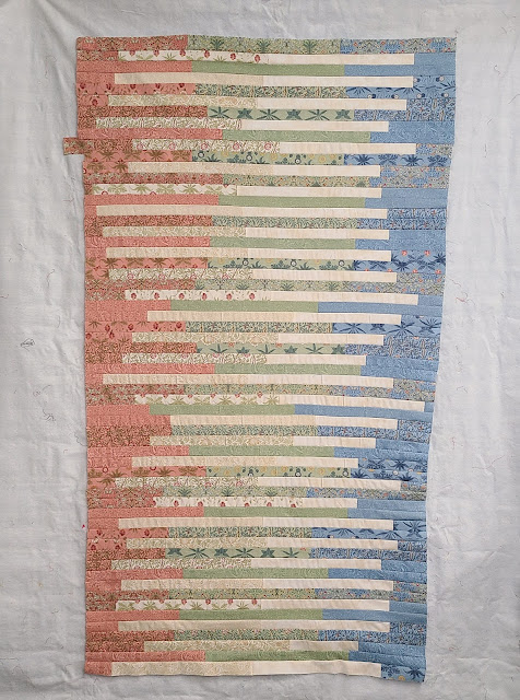 Using a moda William Morris Spring Honey Bun and some Northcott Toscana then cutting each strip in half ...roughly then sewing together....and wah la...this interesting sequence.